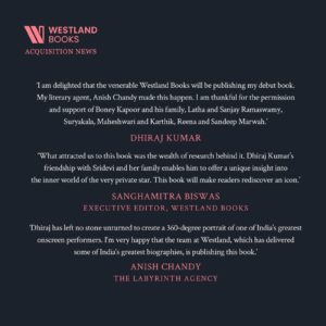 இந்தியாவின் மிகச் சிறந்த நடிகைகளில் ஒருவரான ஸ்ரீதேவி குறித்தான இந்தப் புத்தகத்தில் எந்தவொரு விஷயத்தையும் விட்டுவைக்காமல் 360 டிகிரியிலான விஷயத்தை தீரஜ் கொடுத்துள்ளார். இந்தியாவின் மிகச்சிறந்த பயோகிராஃபிஸை கொடுத்த வெஸ்ட்லாண்ட் இந்தப் புத்தகத்தை பப்ளிஷ் செய்வதில் மகிழ்ச்சி அடைகிறோம்.