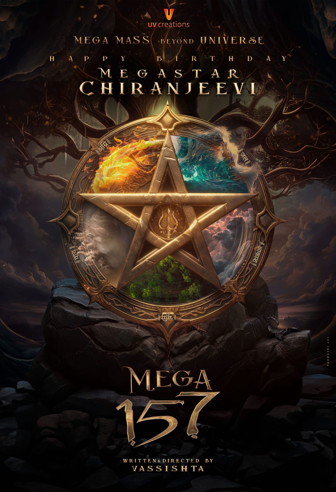 மெகாஸ்டார் சிரஞ்சீவியின் பிறந்தநாளை முன்னிட்டு இன்று அதிகாரப்பூர்வமாக அறிவிக்கப்பட்டுள்ள இப்படத்தின் மூலம் மெகா மாஸ் யுனிவர்ஸை வசிஷ்டா நமக்குக் காட்டப் போகிறார். வசீகரிக்கும் அறிவிப்பு சுவரொட்டியில் பூமி, நீர், நெருப்பு, காற்று மற்றும் வானம் போன்ற பஞ்சபூதங்கள் (இயற்கையின் ஐந்து கூறுகள்) நட்சத்திர வடிவத்தில், திரிசூலத்துடன் கூடிய ஒரு பொருளில் சூழப்பட்டுள்ளது. நாம் நினைத்துக்கூடப் பார்க்க முடியாத ஒன்றை நாம் காணப் போகிறோம் என்பது இந்த அற்புதமான போஸ்டரின் மூலம் உறுதிப்படுத்தப்பட்டுள்ளது.