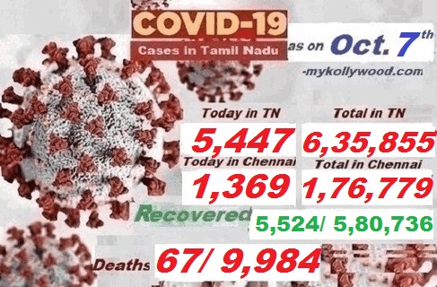 #Covid-19, #Coronavirus in Tamil Nadu – Latest News as on 7th Oct., Corona News By admin On Oct 9, 2020 Share தமிழகத்தில் கொரோனாவால் பாதிக்கப் பட்டவர்களின் எண்ணிக்கை 6,35,855-ஆக உயர்வு. இன்று மட்டும் 5,447 பேருக்கு கொரோனா பாதிப்பு உறுதிப்படுத்தப்படுள்ளது. தமிழகத்தில் ஏப்ரல் முதல் வாரத்தில் இருந்து கொரோனா பாதிக்கப்பட்டவர்களின் எண்ணிக்கை அதிகரித்த வண்ணமே இருந்தன. பாதிக்கப்பட்டவர்களின் எண்ணிக்கை 6,35,000–த்தை தாண்டியது. இன்றைய 5,447 எண்ணிக்கையுடன் ஒட்டுமொத்தமாக தமிழகத்தில் இதுவரை 6,35,855 பேர் கொரோனாவால் பாதிக்கப்பட்டுள்ளனர். இன்று 5,447 பேர் புதிதாக பாதிக்கப்பட்டனர். இதில் 1,369 பேர் சென்னை சேர்ந்தவர்கள் ஆவார்கள். இதனால் சென்னையில் பாதிக்கப் பட்டவர்களின் எண்ணிக்கை 1,76,779. இன்று 5,524 பேர் குணமடைந்து வீடு திரும்பியுள்ளனர். இதுவரை மொத்தமாக 5,75,212 பேர் குணமடைந்து வீடு திரும்பியுள்ளனர். இறப்பு –67/ 9,984 Share