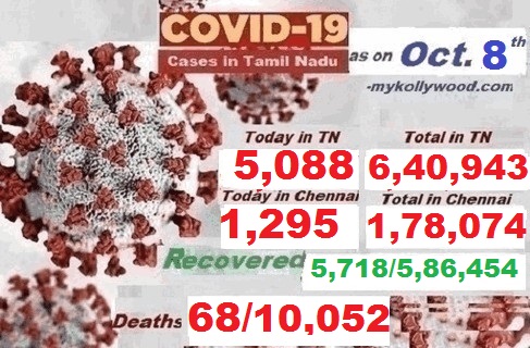 #Covid-19, #Coronavirus in Tamil Nadu – Latest News as on 8th Oct., Corona News By admin On Oct 9, 2020 Share தமிழகத்தில் கொரோனாவால் பாதிக்கப் பட்டவர்களின் எண்ணிக்கை 6,40,943-ஆக உயர்வு. இன்று மட்டும் 5,088 பேருக்கு கொரோனா பாதிப்பு உறுதிப்படுத்தப்படுள்ளது. தமிழகத்தில் ஏப்ரல் முதல் வாரத்தில் இருந்து கொரோனா பாதிக்கப்பட்டவர்களின் எண்ணிக்கை அதிகரித்த வண்ணமே இருந்தன. பாதிக்கப்பட்டவர்களின் எண்ணிக்கை 6,40,000–த்தை தாண்டியது. இன்றைய 5,088 எண்ணிக்கையுடன் ஒட்டுமொத்தமாக தமிழகத்தில் இதுவரை 6,40,943 பேர் கொரோனாவால் பாதிக்கப்பட்டுள்ளனர். தமிழகத்தில் இன்று 5,088 பேர் புதிதாக பாதிக்கப்பட்டனர். இதில் 1,295 பேர் சென்னை சேர்ந்தவர்கள் ஆவார்கள். இதனால் சென்னையில் பாதிக்கப் பட்டவர்களின் எண்ணிக்கை 1,78,074. இன்று 5,718 பேர் குணமடைந்து வீடு திரும்பியுள்ளனர். இதுவரை மொத்தமாக 5,86,454 பேர் குணமடைந்து வீடு திரும்பியுள்ளனர். இறப்பு –68/ 10,052 Share